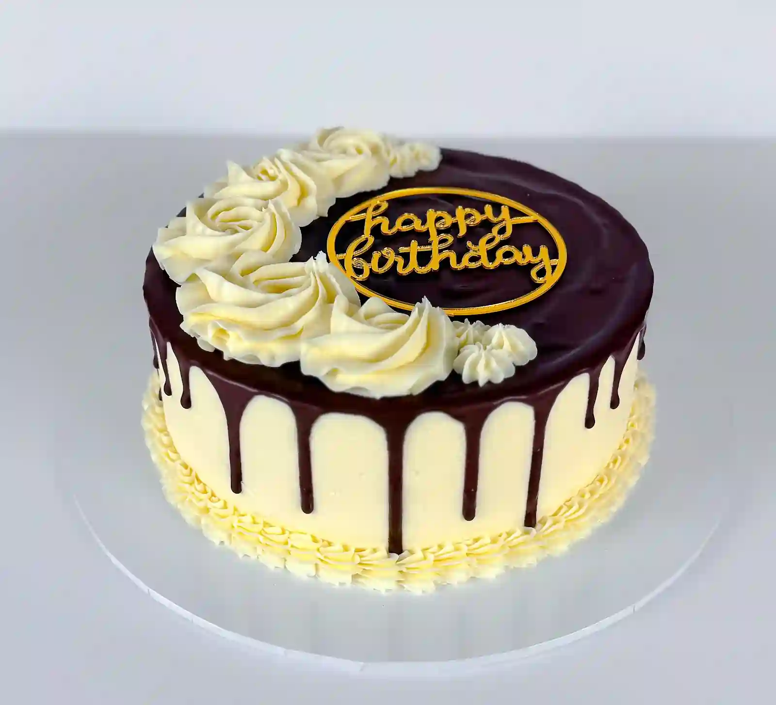 This chocolate fall two layer cake is coated with rich decadent chocolate. It is perfect for all chocolate lovers celebrating birthdays or other special occasions. Choose silky vanilla, rich chocolate cream, or moist red velvet. Vanilla exterior with dark chocolate drip cascading down the sides. Topped with hand-piped cream rosettes and gold "Happy Birthday" script.