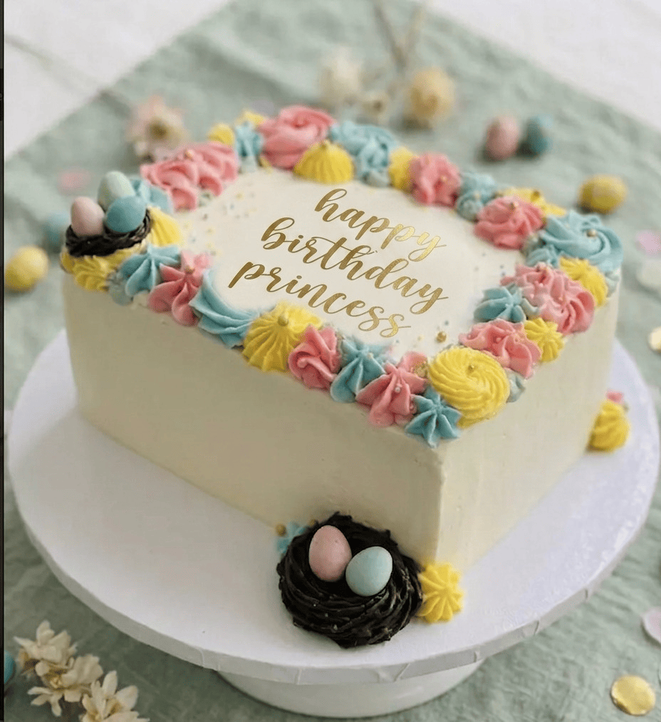 The base features pastel confetti details and a border of piped flowers in pink, blue, yellow, and green. Charming fondant nests with speckled eggs complete the design.