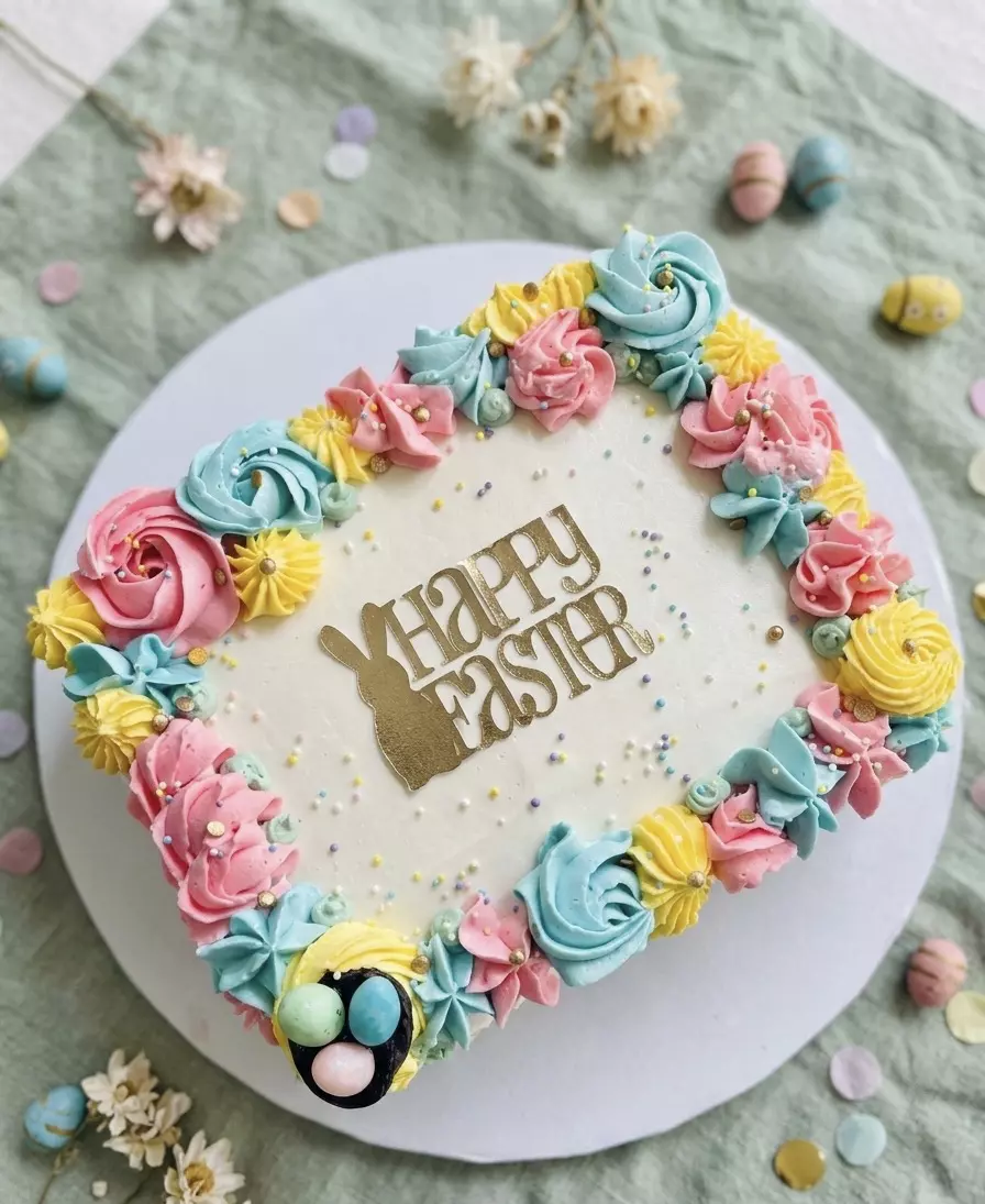 The base features pastel confetti details and a border of piped flowers in pink, blue, yellow, and green. Charming fondant nests with speckled eggs complete the design.