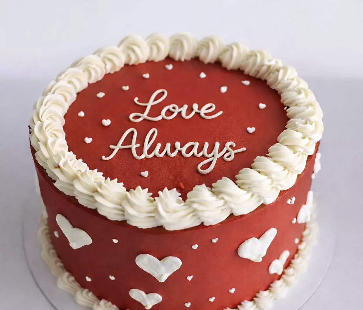 Baked with soft, moist red velvet, rich chocolate or silky vanilla sponge and layered with smooth cream frosting, this cake delivers rich flavour with a refined finish. The elegant red design and subtle heart details make it ideal for Valentine’s Day, anniversaries, special holidays and meaningful celebrations.