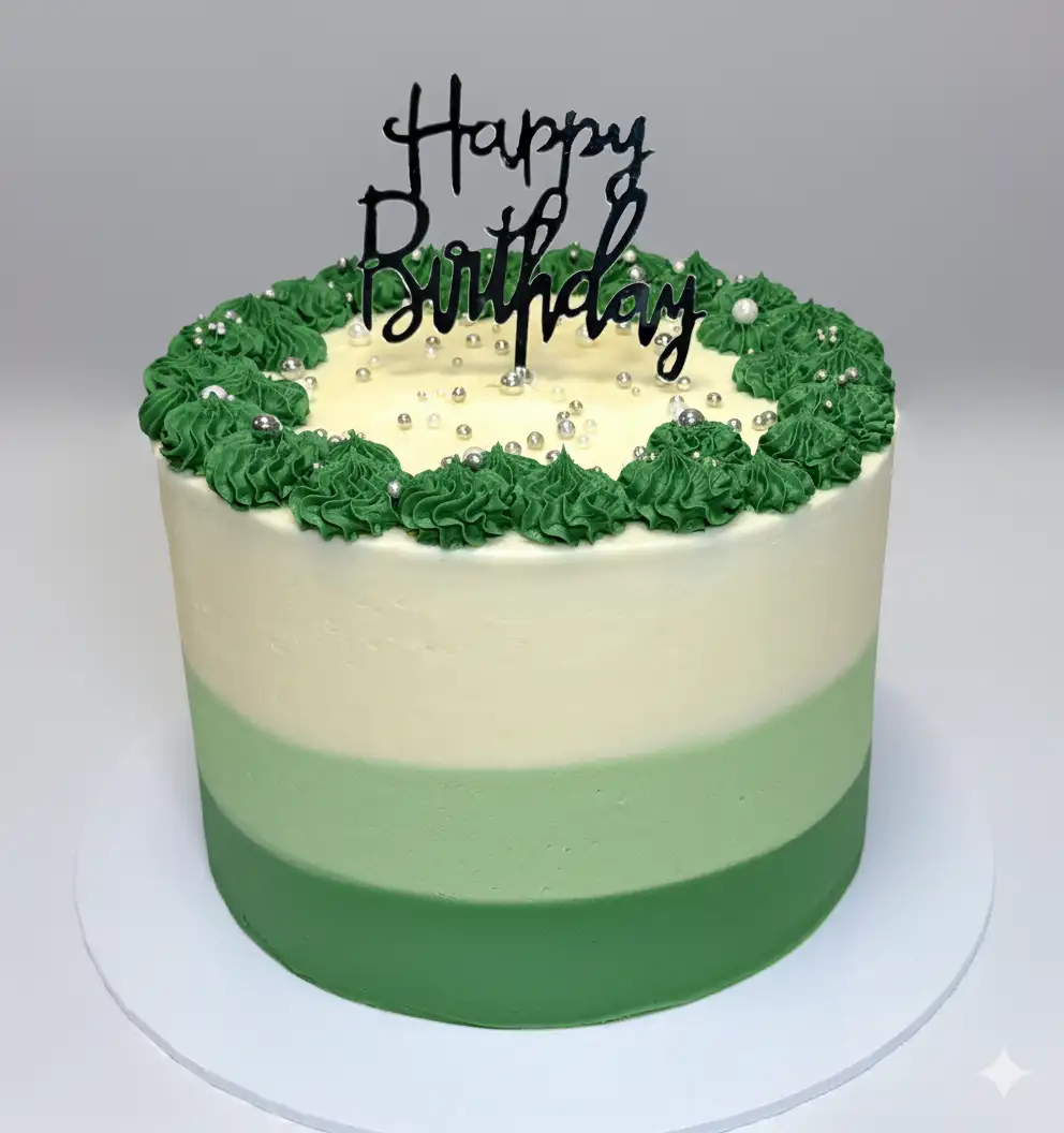 This four layer fluffy frost cake melts in your mouth because of it's creamy delight and smooth silky finish. Beautiful ombre effect with contrasting cream and tones. Topped with hand-piped rosettes, pearl beads, cool color gradient with a modern aesthetic. The ombre layers make it visually striking. Freshly baked when you order. Perfect for birthday parties and special occasions.
